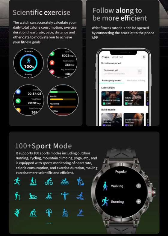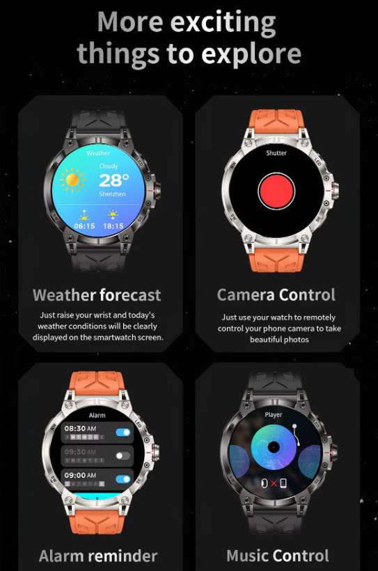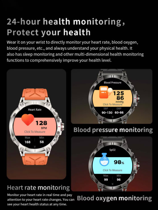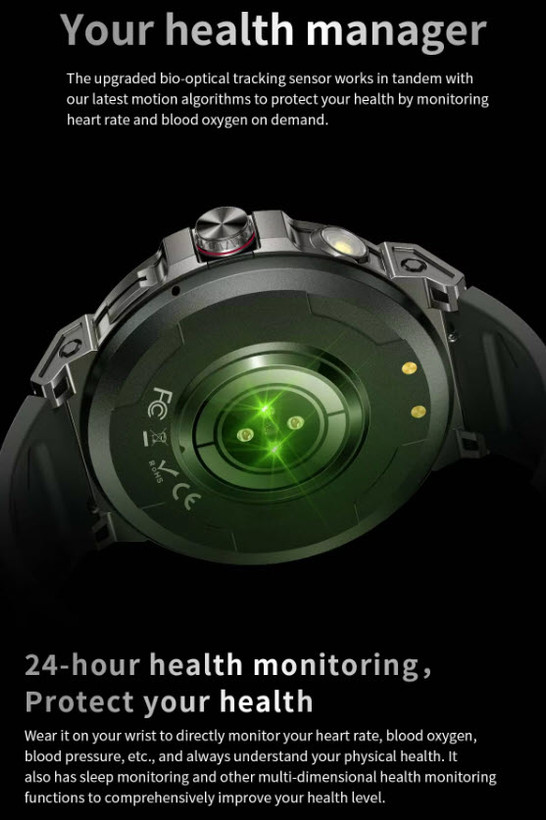 نظارت بر سلامت: نظارت بر ضربان قلب، نظارت بر فشار خون، نظارت بر اکسیژن خون، نظارت بر خواب، اندازهگیری ضربان قلب در تمام طول روز شمارش قدم، شمارش کالری، مسافت، کرونومتر، تایمر